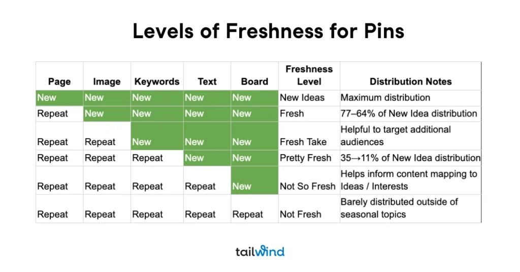 Freshness spans five levels: New Ideas, Fresh, Fresh Take, Pretty Fresh, Not So Fresh, and Not Fresh. Each level depends on how many elements of a Pin are new (the page it links to, the image, keywords, text, and board). More novelty earns more distribution, but lower levels still have jobs to do.